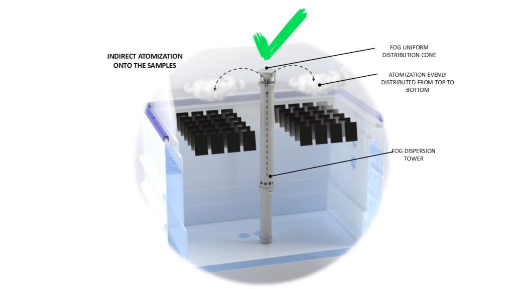 • The atomization nozzle must produce a FOG and not droplets (peristaltic pumps), complying with the Venturi principle (ASTM B117); peristaltic pumps are not recommended. The distance of the atomization flow can be controlled through the pressure of the bubble tower. Droplets of solution are not acceptable during atomization.